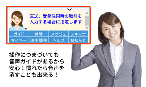カシオのシンプル販売管理ソフトにはサポートパネルという機能があります。そのパネル内に「音声ガイドボタン」があり、使い方を教えてくれる画面が表示されます。 これで片手にマニュアルを見ながら操作を進めていく必要がなく、快適に伝票作成などが行えます。操作に慣れてきたら表示を閉じることも可能です。