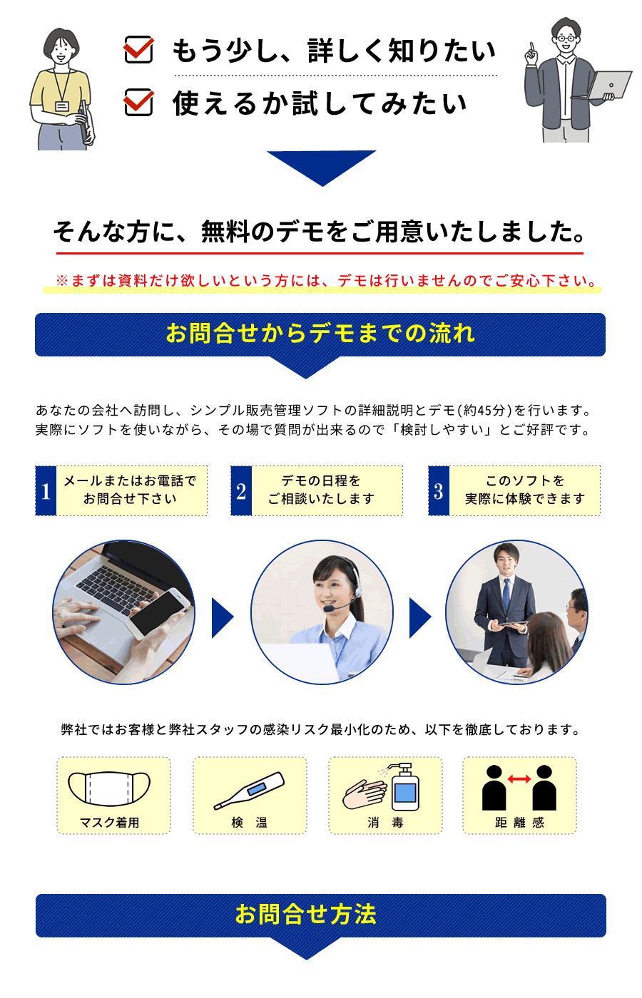 現状との比較や、実際に導入したイメージを見ることができます。その場でご質問やご相談なども出来るので、大変、人気がございます。デモサービスはもちろん無料で行いますのでご安心下さい。