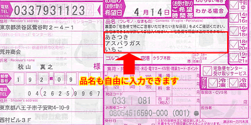 品名も手書きではなく、自由に入力出来ます。誤字脱字が無く、運送会社やお届け先にも分かり易く印刷出来ます。