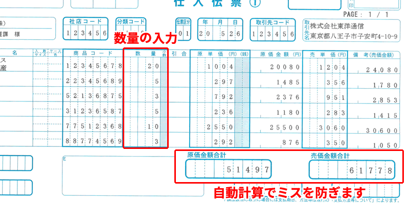 原価金額、売価金額、合計金額などは自動計算されます。計算ミスが無くなります!