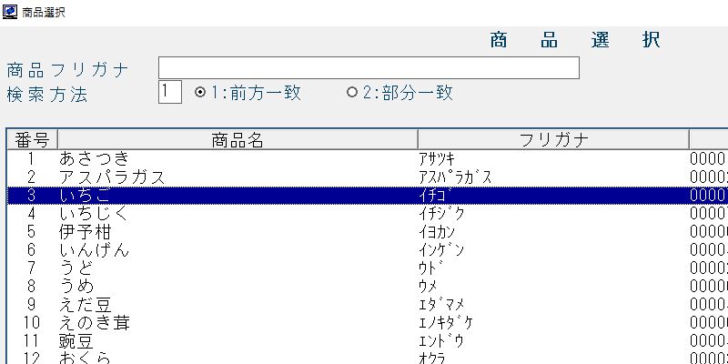 商品名の選択方法には、商品名の略号、コード、名称、フリガナ、分類、コード入力、取引回数順があり、探しやすい方法を選べて、すぐに呼び出したい商品名が表示されます。商品検索に時間を掛けることなく、スピーディーに伝票作成が出来ます。