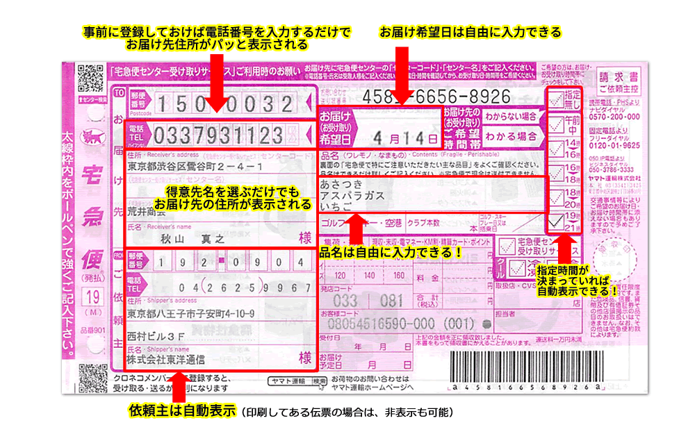 品名も手書きではなく、自由に入力出来ます。誤字脱字が無く、運送会社やお届け先にも分かり易く印刷出来ます。